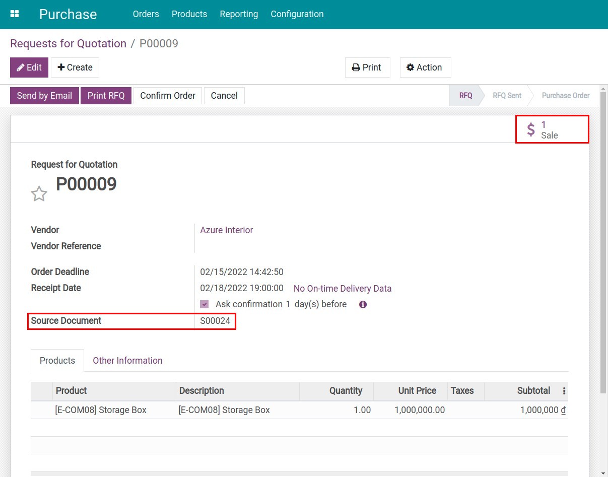 After the sales order (SO) is confirmed, a request for quotation (RFQ) will be created and linked to that sales order. To access the RFQ, click on the Purchase icon on the SO or go to the Purchase app, and search by source document with the SO number as the value.