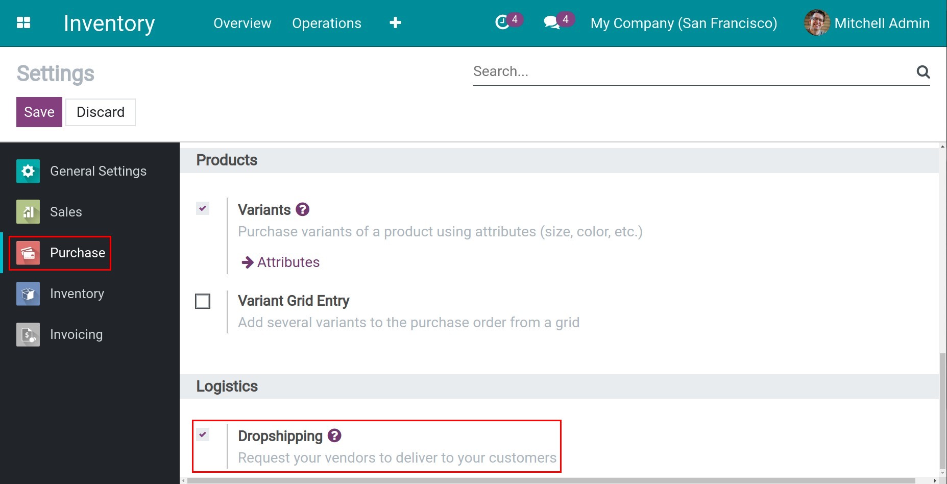 Now let’s go to the Purchase app, check the box Dropshipping in the Logistics section and save all the settings by clicking on the Save button.