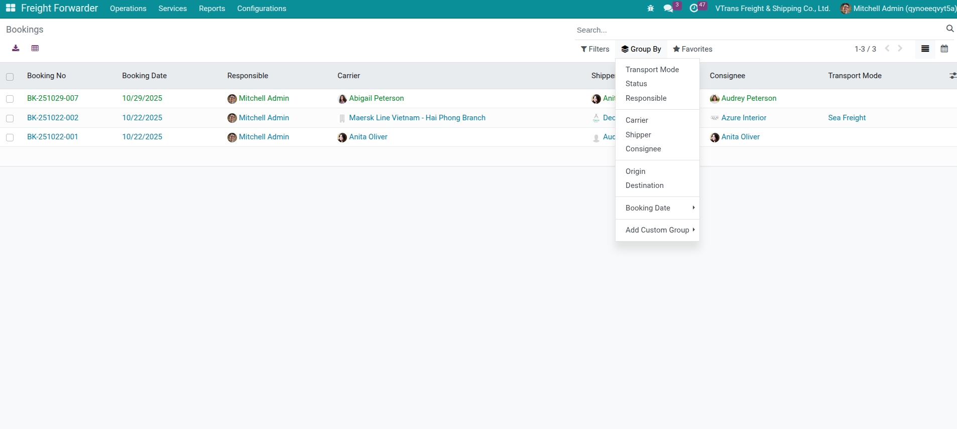 Apply Filters to focus on Draft, Confirmed, Cancelled, Single-Leg, or Multi-Leg bookings. Combine filters with Group By options (Transport Mode, Status, Responsible, Carrier, Shipper/Consignee, Booking Date) to analyze workloads.