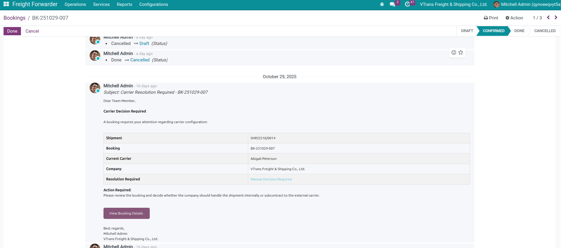 After confirming a booking, open the shipment to ensure carrier, ETD/ETA, and MBL fields reflect the latest data. Reconfirm or adjust if anything is missing.