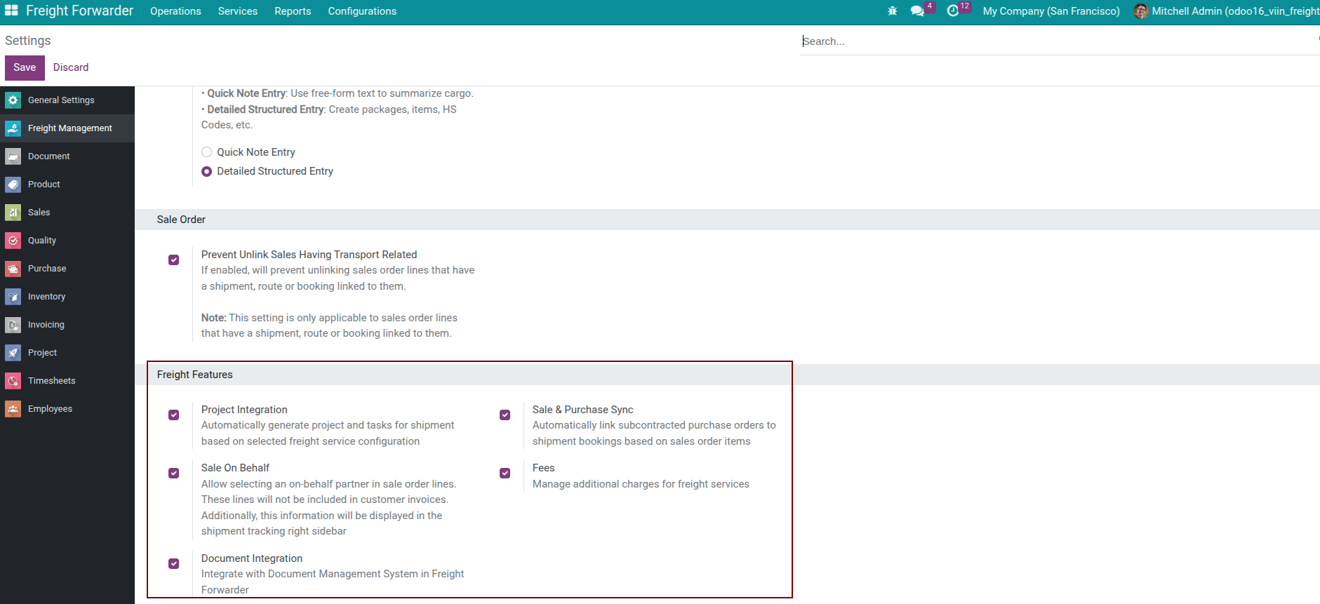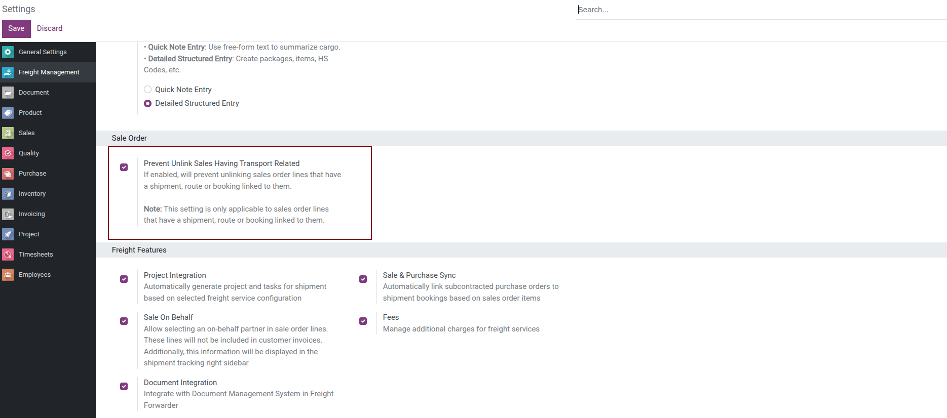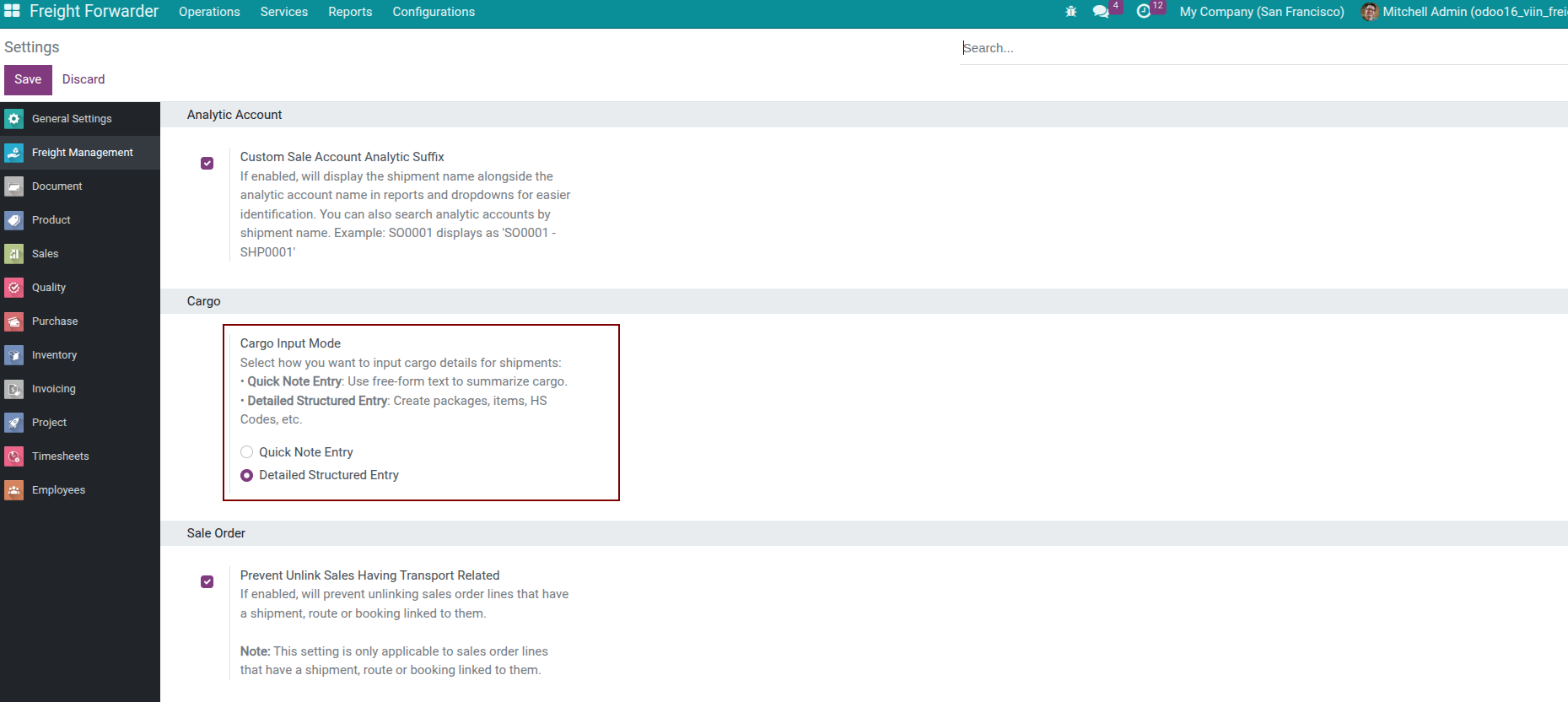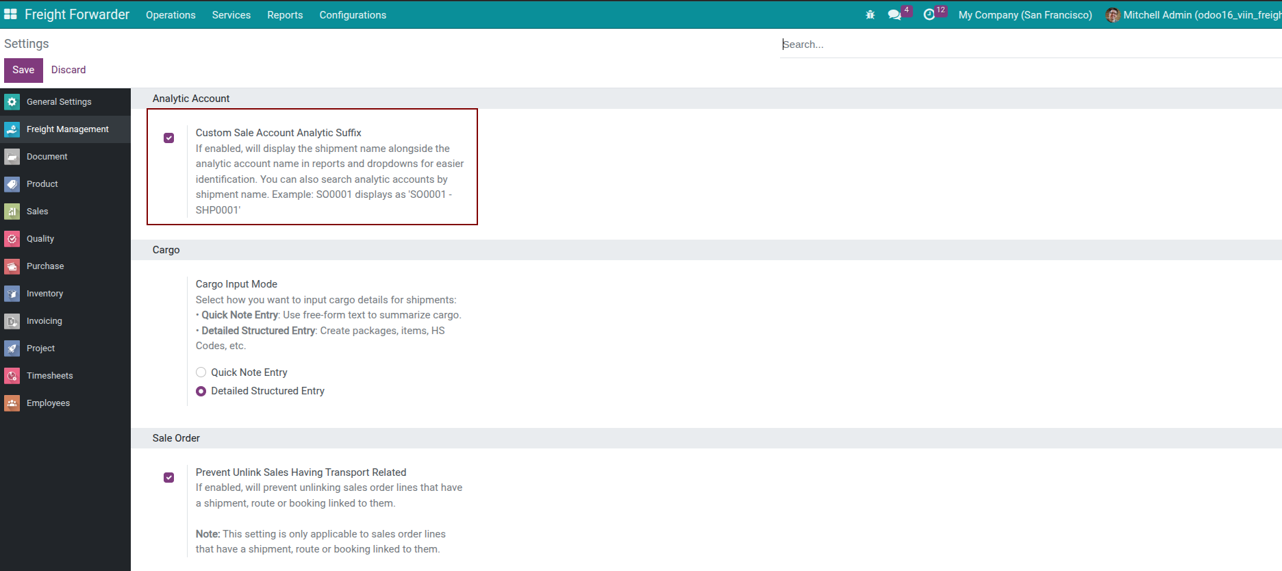 Review the baseline freight settings—analytic account suffix, cargo input modes, and safeguards for sales orders—before enabling advanced features.