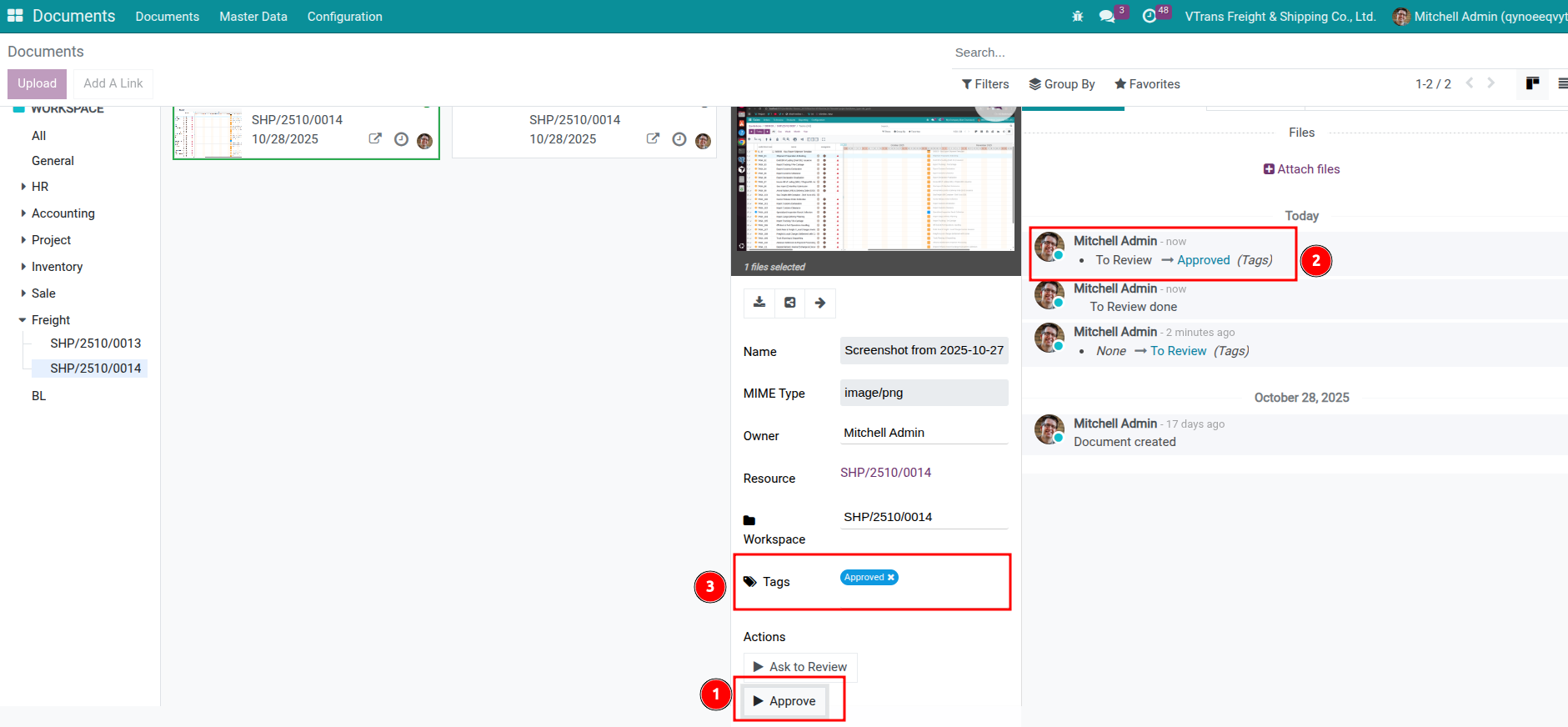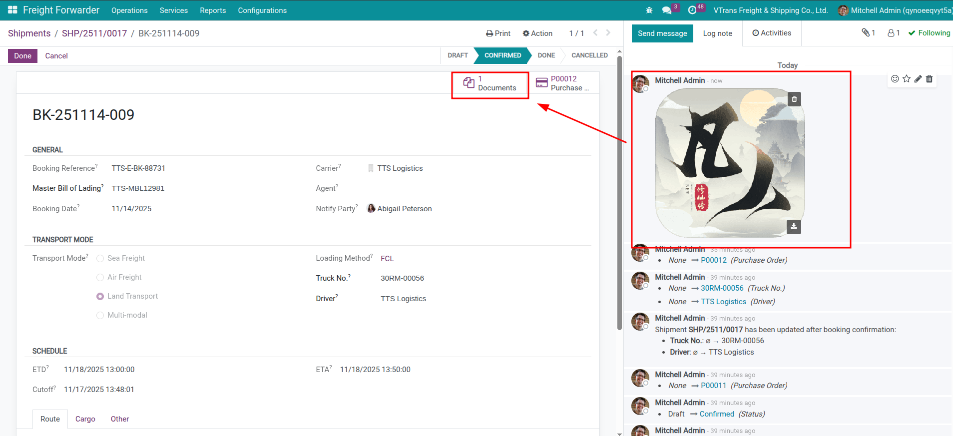 Upload files by dragging them into the shipment chatter—the system stores them in the Freight workspace and links them to the shipment automatically.