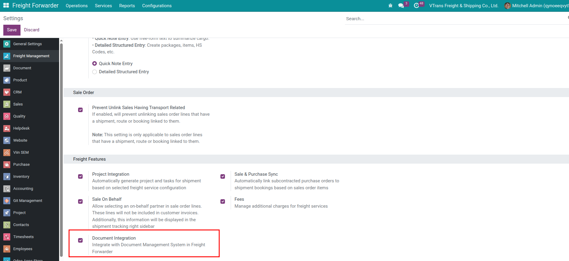 Administrators can install viin_document_freight directly from Apps. The setting toggles on automatically once the module is installed.