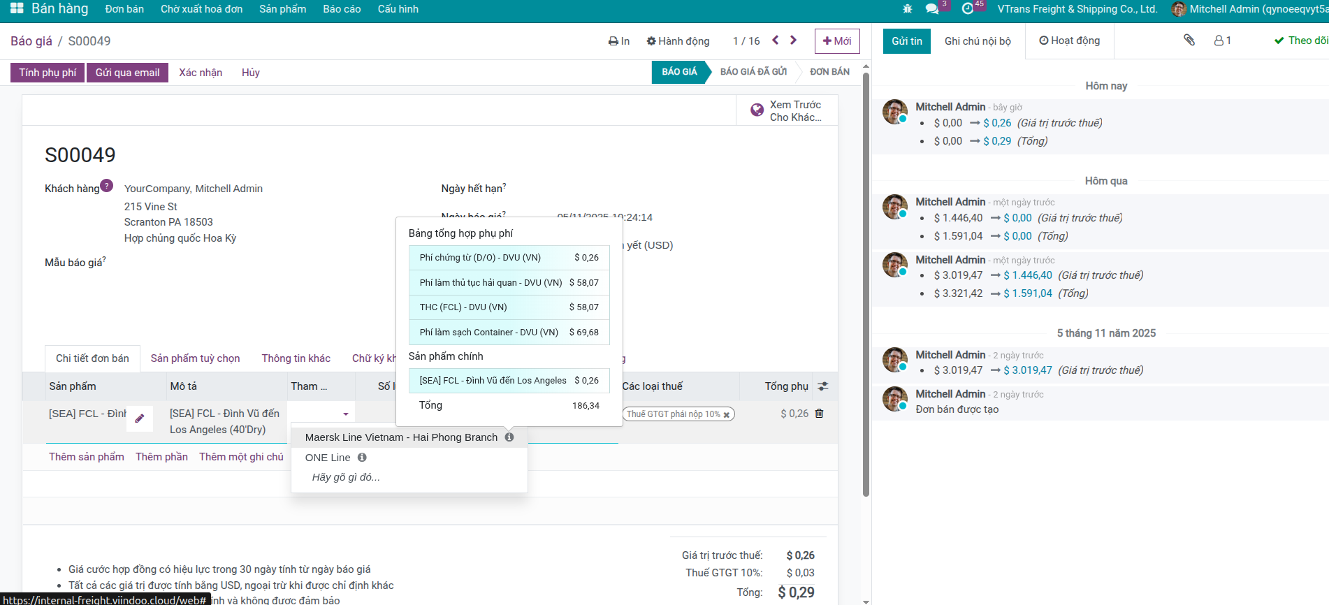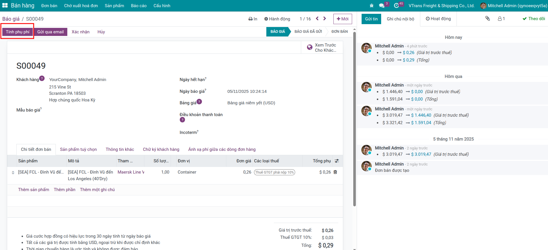 Product Feessection below the main lines listing every local charge and service charge linked to the freight products.Review the generated lines: