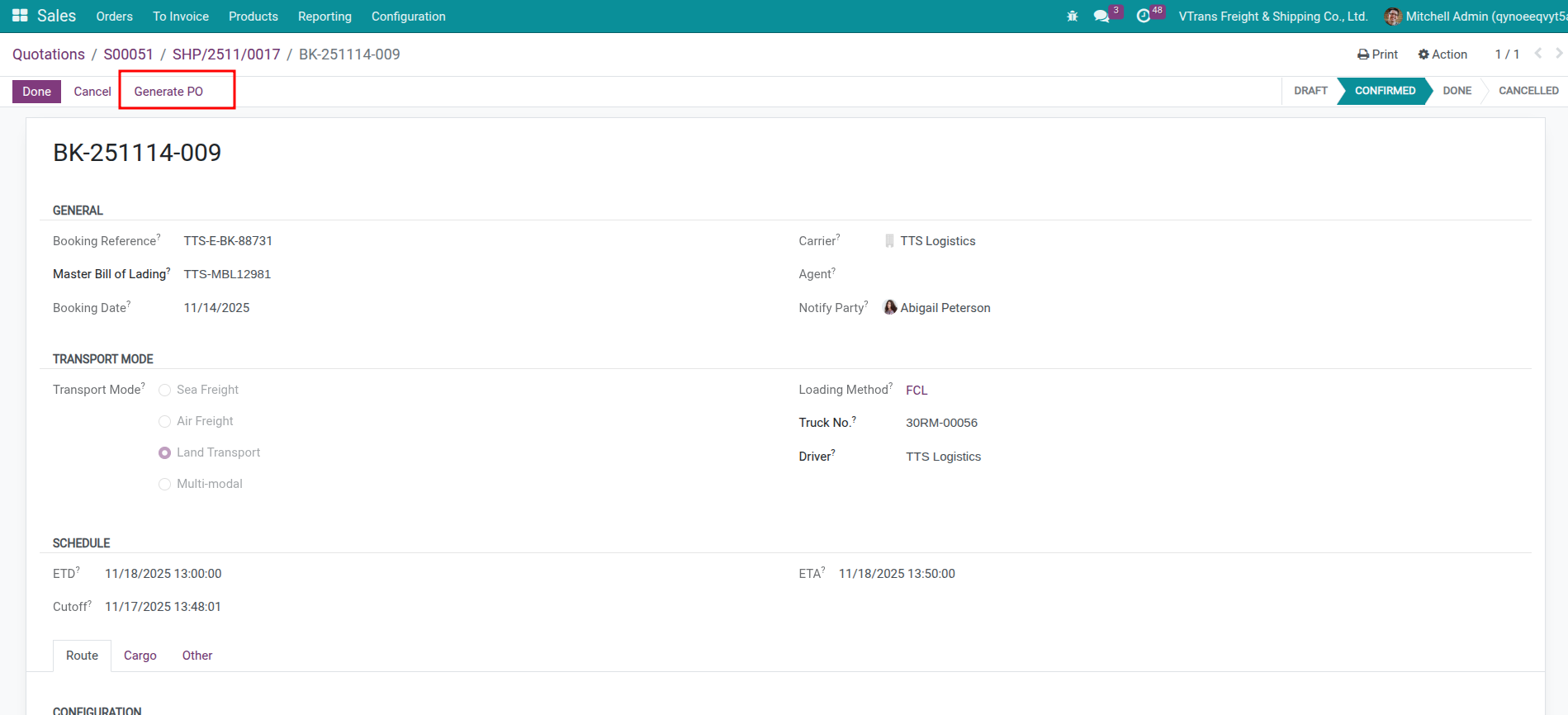 Once the booking has a carrier and the leg is marked for outsourcing, a Generate PO button appears on the booking.