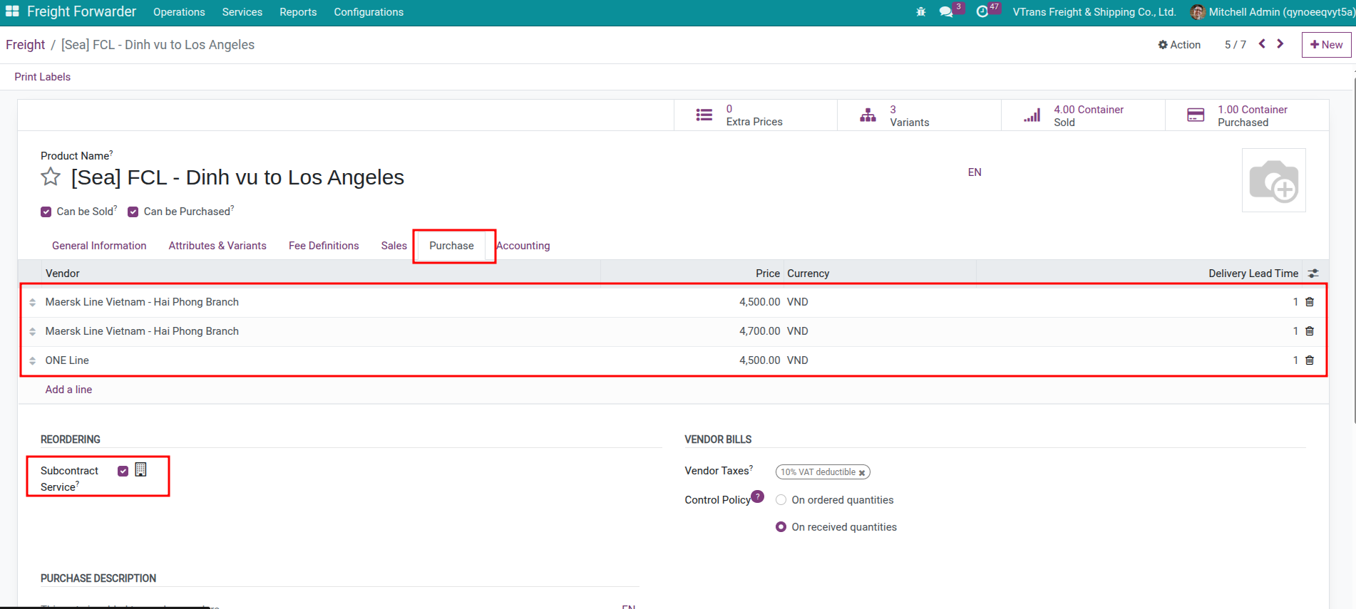 When should I enable “Subcontract Service”? Enable it only when the service always requires a vendor (e.g., ocean freight, air freight). Leave it off for services sometimes handled internally (domestic trucking, warehousing).