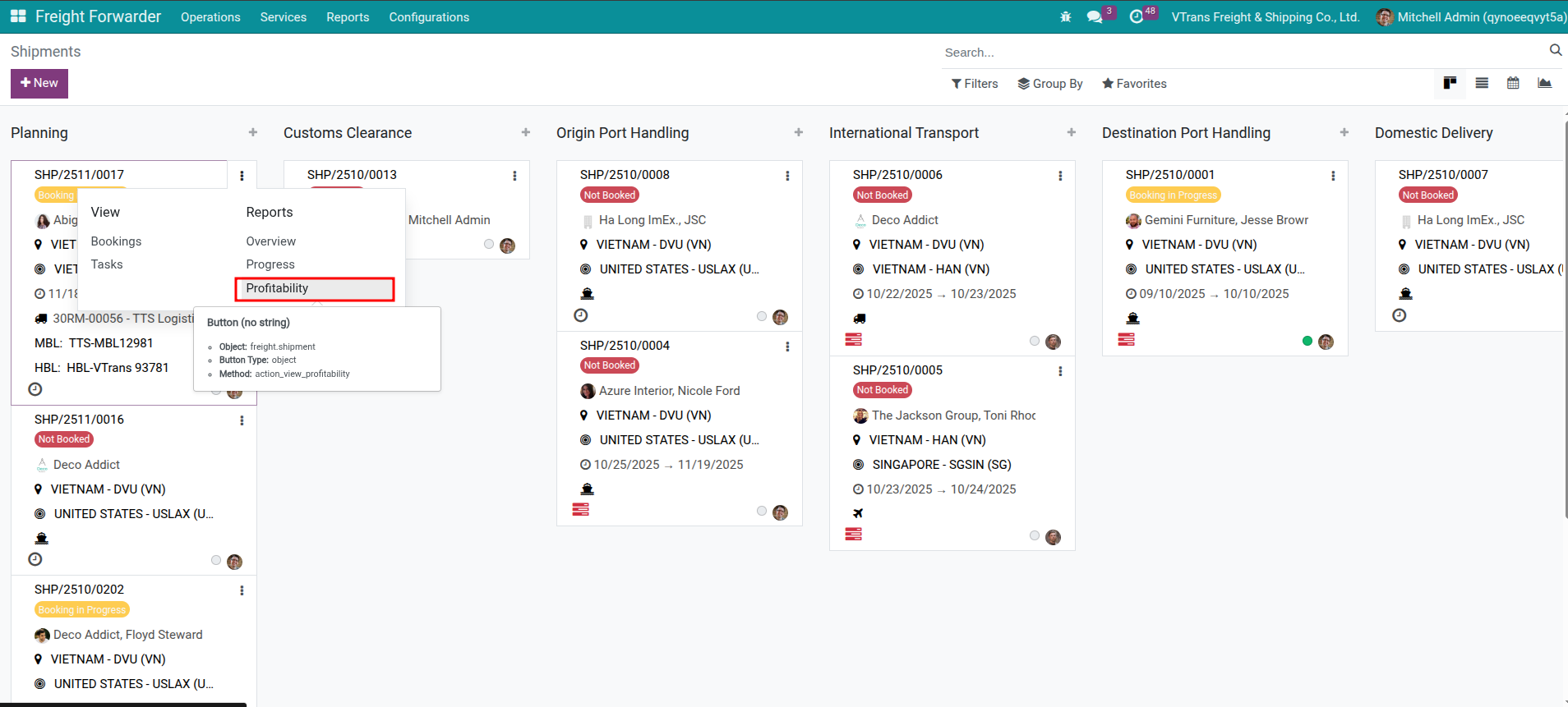 On the shipment kanban view, click Profitability.