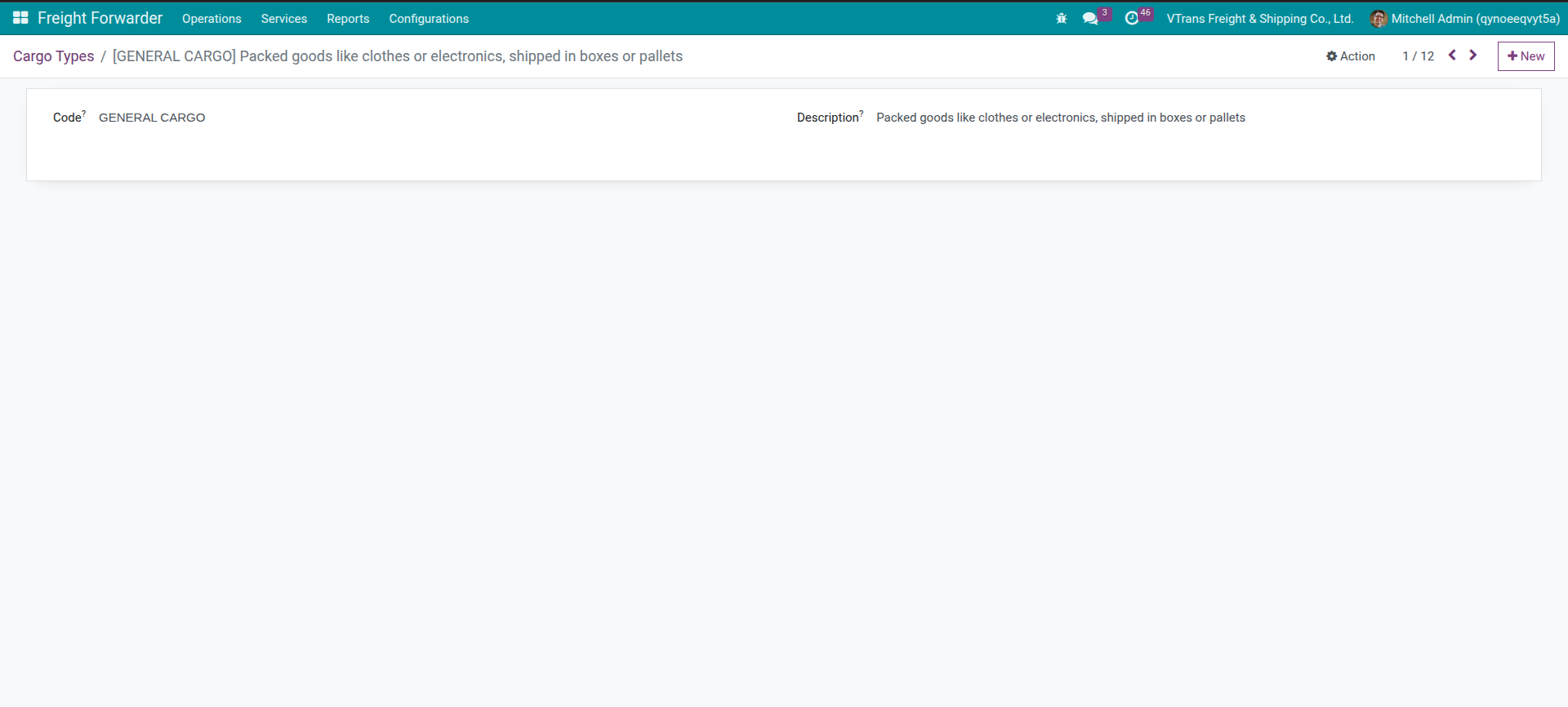 General Cargo,Refrigerated,Dangerous GoodsGo to Freight Forwarder > Configurations > Cargo Information > Cargo Types to maintain the master data. Each Cargo Type must have a unique code (the model automatically uppercases it) and you can add handling instructions in the description so they appear wherever the type is referenced. Investing a few minutes to prepare this catalog keeps templates consistent and helps the operations team filter shipments by cargo characteristics later on.