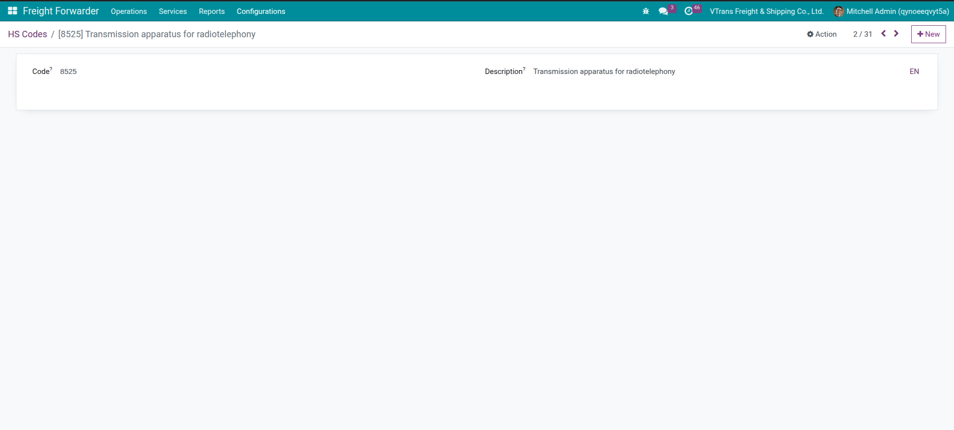 Manage HS codes centrally via Freight Forwarder > Configurations > Cargo Information > HS Codes. Similar to Cargo Types, codes are forced to be unique and uppercased, so you can safely reuse them across cargo templates, quotations, and customs jobs. Pre-fill the description with local regulation notes (e.g., import license requirement, VAT rate) and link the HS code to cargo templates to estimate import taxes automatically.