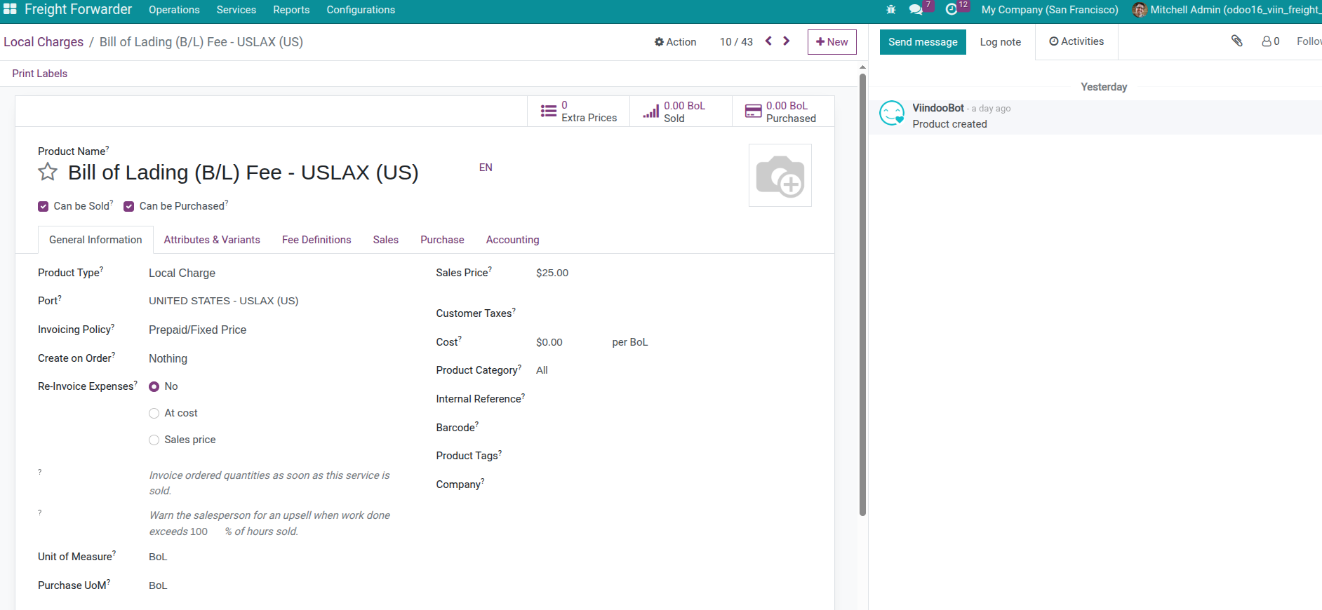 To create a new Local Charge, access Freight Forwarder > Services > Local Charges > Create.