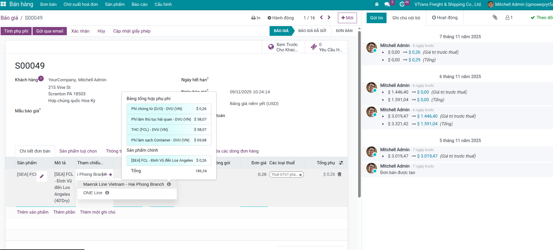 This feature requires installing Freight Charges & Local Fees (viin_freight_fee). When selecting products with accompanying fees in quotations, the system will automatically suggest adding related fees.
